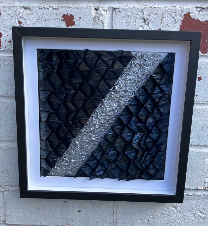 "Reflect". Recycled stanley blades in box frame. Frame size......32cm x 32cm.