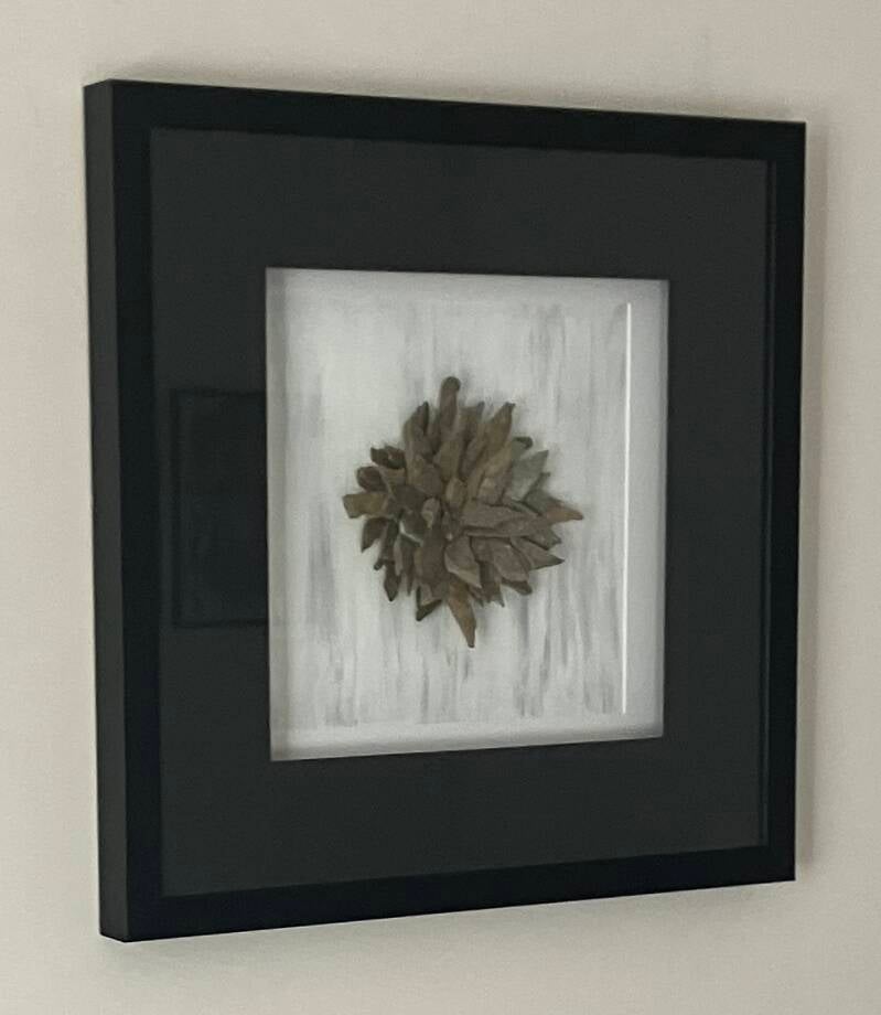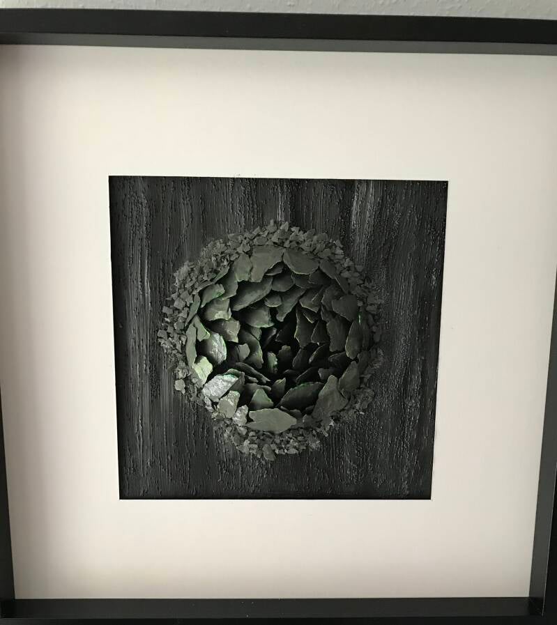 “Blooming”, slate fragments painted and varnished in box frame. Frame size..52cm x 52cm.
