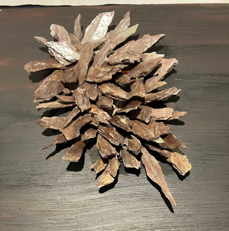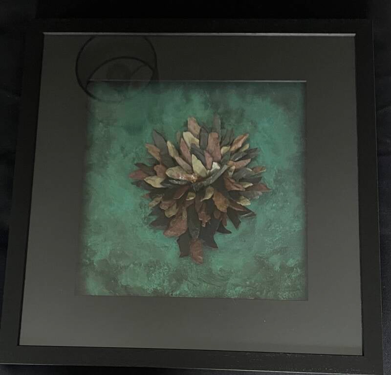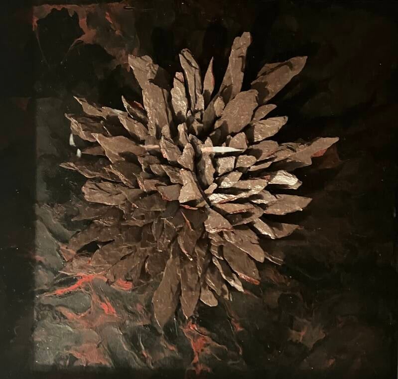 'Earth Bloom'. Cornish slate and Yorkshire stone with textured background set in box frame. Frame size 32cm x 32cm.