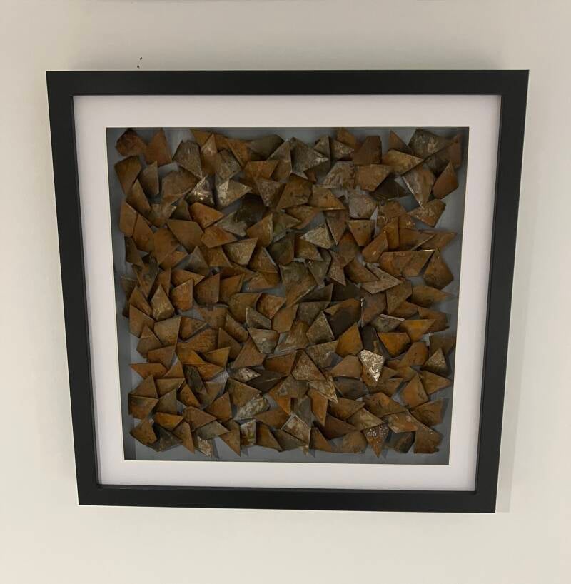 'Autumn'. Recycled and rusted blades set into box frame. Frame size 32cm x 32cm.