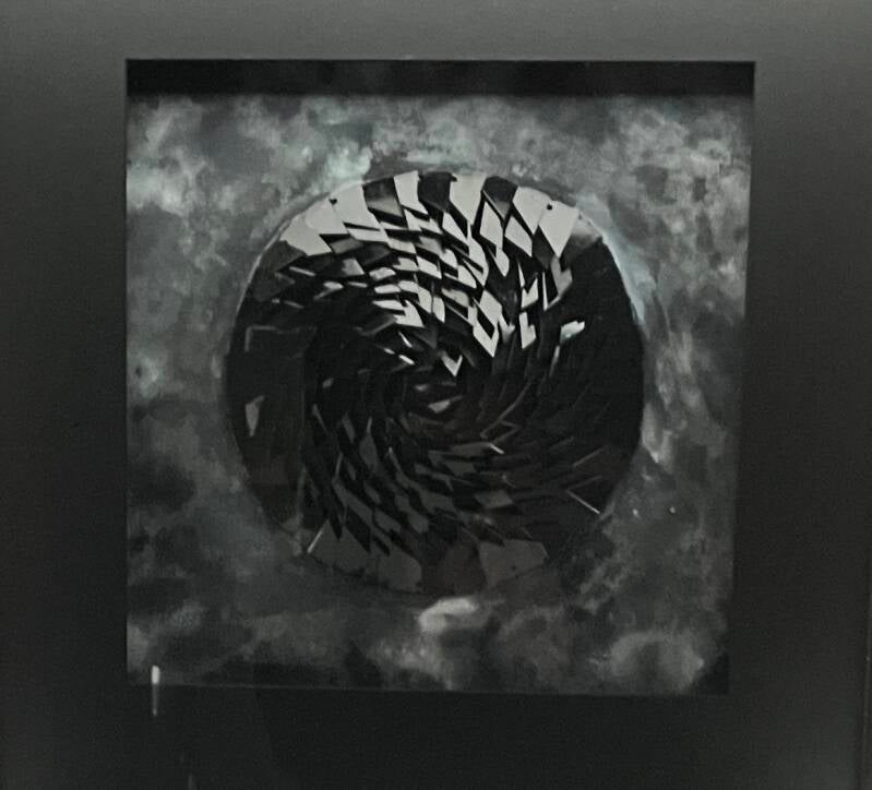 'Portal'. Recycled blades set into box frame. Frame size....55cm x 55cm.